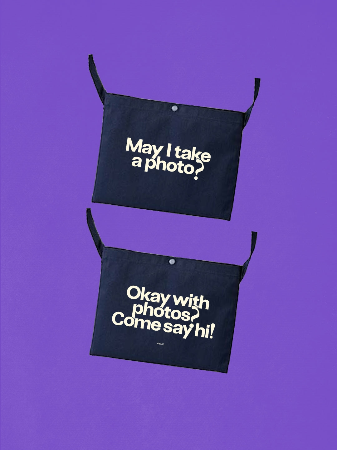 海外での撮影やガラス越しなど言葉が通じにくい場面で、このサコッシュを見せるだけで撮影してもよいかを確認できるシューティング・アイテム。イベントやフォトウォーク、撮影現場で使うのにも、とても便利なサイズ感です。